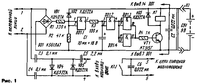 Напряжение телефонной линии приложено к делителю на резисторах R1 и R2. Когда трубка лежит на рычаге, в линии напряжение около 60 В, на выходе элемента DD1.1 низкий уровень, конденсатор С1 разряжен, на выходе DD1.3 также низкий уровень, транзистор VT1 закрыт, реле К1 обесточено, питание магнитофона выключено. При снятии трубки напряжение в линии падает до 5...12 В, на выходе DD1.1 - высокий уровень, конденсатор С1 начинает заряжаться через резистор R3. При достижении на выводах конденсатора порогового уровня состояние элементов DD1.2 и DD1.3 изменяется на противоположное, в результате чего на выходе DD1.3 появляется высокий уровень. Транзистор VT1 открывается, реле К1 срабатывает. Через замыкающиеся контакты реле поступает питание на магнитофон. Напряжение звуковой частоты с линии подается через цепь СЗ, С4, VD4, VD5, С5 на линейный вход магнитофона. По окончании разговора, как только телефонная трубка будет положена на рычаг, напряжение в линии возрастет до 60 В. На выходе элемента DD1.1 появляется низкий уровень. Конденсатор С1 начинает разряжаться через резистор R3 и элемент DD1.1. Как только напряжение на конденсаторе достигнет порогового уровня, элементы DD1.2 и DD1.3 изменят свое состояние. Транзистор VT1 закроется, контакты реле К1 разомкнутся и отключат питание магнитофона. Поскольку постоянная времени цепи R3C1 значительно больше периода следования серии "наборных" импульсов, при снятии трубки и наборе номера магнитофон остается обесточенным. Однако, если снять трубку и не набирать номер какое-то время, конденсатор С1 успеет зарядиться и магнитофон включится. Посылка сигнала вызова (80...120 В, 25 Гц) также не изменяет состояния элементов DD1.2 и DD1.3. Диод VD2 ограничивает напряжение на входе элемента DD1.1. Сопротивление конденсаторов СЗ и С4 на частоте 25 Гц высоко, поэтому они не шунтируют вызывной сигнал. Диоды VD4 и VD5 ограничивают напряжение на входе магнитофона на уровне 0,6...0,7 В. Микросхема К561ЛА7 заменима на К561ЛЕ5, а также на аналогичные серий К176 и 564. Диодную сборку КЦ407А (VD1) можно заменить на КЦ402Б, КЦ405Б или четырьмя диодами с допустимым обратным напряжением более 200 В. Транзистор VT1 - структуры п-р-п с допустимой мощностью рассеяния коллектора не менее 150 мВт. Реле К1 - на напряжение срабатывания 5...7 В, например, РЭС10 (паспорт РС4.524.302 или 031-04-02), РЭС15 (паспорт РС4.591.003). Детали устройства смонтированы на печатной плате из фольгированного стеклотекстолита. Налаживание устройства сводится к подбору резисторов R1 и R2 для обеспечения четкого срабатывания элемента DD1.1 при поднятии и опускании трубки. Но сопротивление резистора R1 не должно быть менее 330 кОм. Время задержки срабатывания реле можно, в случае необходимости, изменить подбором резистора R3. >> |