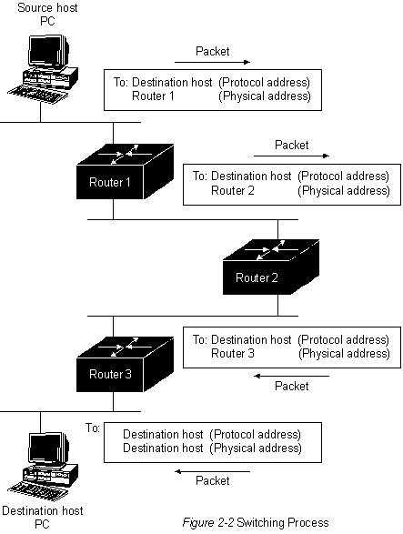 В маршрутных таблицах может содержаться также и другая информация. "Показатели" обеспечивают информацию о желательности какого-либо канала или тракта. Роутеры сравнивают показатели, чтобы определить оптамальные маршруты. Показатели отличаются друг oт друга в зависимости от использованной схемы алгоритма маршрутизации. Далее в этой главе будет представлен и описан ряд общих показателей. Роутеры сообщаются друг с другом (и поддерживают свои маршрутные таблицы) путем передачи различных сообщений. Одним из видов таких сообщений является сообщение об "обновлении маршрутизации". Обновления маршрутизации обычно включают всю маршрутную таблицу или ее часть. Анализируя информацию об обновлении маршрутизации, поступающую ото всех роутеров, любой из них может построить детальную картину топологии сети. Другим примером сообщений, которыми обмениваются роутеры, является "объявление о состоянии канала". Объявление о состоянии канала информирует другие роутеры о состоянии кааналов отправителя. Канальная информация также может быть использована для построения полной картины топологии сети. После того, как топология сети становится понятной, роутеры могут определить оптимальные маршруты к пунктам назначения. Коммутация Алгоритмы коммутации сравнительно просты и в основном одинаковы для большинства протоколов маршрутизации. В большинстве случаев главная вычислительная машина определяет необходимость отправки пакета в другую главную вычислительную машину. Получив определенным способом адрес роутера, главная вычислительная машина-источник отправляет пакет, адресованный специально в физический адрес роутера (уровень МАС), однако с адресом протокола (сетевой уровень) главной вычислительной машины пункта назначения. После проверки адреса протокола пункта назначения пакета роутер определяет, знает он или нет, как передать этот пакет к следующему роутеру. Во втором случае (когда роутер не знает, как переслать пакет) пакет, как правило, игнорируется. В первом случае роутер отсылает пакет к следующей роутеру путем замены физического адреса пункта назначения на физический адрес следующего роутера и последующей передачи пакета. Следующая пересылка может быть или не быть главной вычислительной машиной окончательного пункта назначения. Если нет,то следующей пересылкой, как правило, является другой роутер, который выполняет такой же процесс принятия решения о коммутации. По мере того, как пакет продвигается через объединенную сеть, его физический адрес меняется, однако адрес протокола остается неизменным. Этот процесс иллюстрируется на Рис. 2-2.