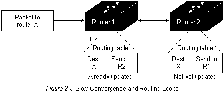 значительные проблемы. Быстрая сходимость Алгоритмы маршрутизации должны быстро сходиться. Сходимость - это процесс соглашения между всеми роутерами по оптимальным маршрутам. Когда какое-нибудь событие в сети приводит к тому, что маршруты или отвергаются, или ставновятся доступными, роутеры рассылают сообщения об обновлении маршрутизации. Сообщения об обновлении маршрутизации пронизывают сети, стимулируя пересчет оптимальных маршрутов и, в конечном итоге, вынуждая все роутеры придти к соглашению по этим маршрутам. Алгоритмы мааршрутизации, которые сходятся медленно, могут привести к образованию петель маршрутизации или выходам из строя сети. На Рис. 2-3 изображена петля