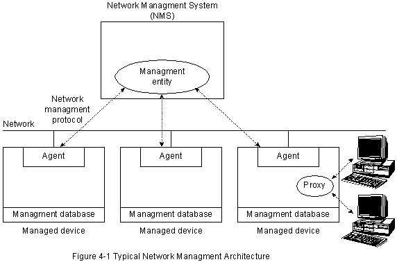 Управляющие об'екты могут также опросить конечные станции, чтобы проверить некоторые переменные. Опрос может быть автоматическим или его может инициировать пользователь. На эти запросы в управляемых устройствах отвечают "агенты". Агенты - это программные модули, которые накапливают информацию об управляемом устройстве, в котором они расположены, хранят эту информацию в "базе данных управления" и предоставляют ее (проактивно или реактивно) в управляющие об'екты, находящиеся в пределах "систем управления сети" (NMSs), через протокол управления сети. В число известных протоколов управления сети входят "the Simple Network Management Protocol (SPMP)" (Протокол Управления Простой Сети) и "Common Management Information Protocol (CMIP)" (Протокол Информации Общего Управления). "Management proxies" (Уполномоченные управления) - это об'екты, которые обеспечивают информацию управления от имени других об'ектов. Типичная архитектура управления сети показана на рисунке ниже:
